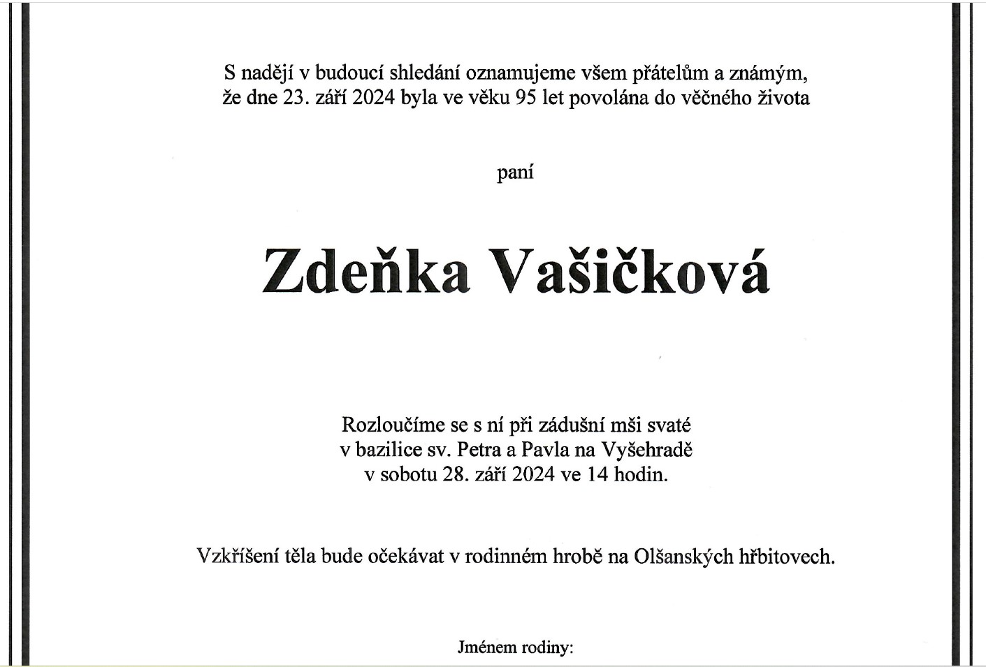 23.09.2024 | V pondělí 23. 9. zemřela farnice paní Z. Vašičková. Pohřeb bude v sobotu 28. 9. ve 14:00 v bazilice sv. Petra a Pavla.